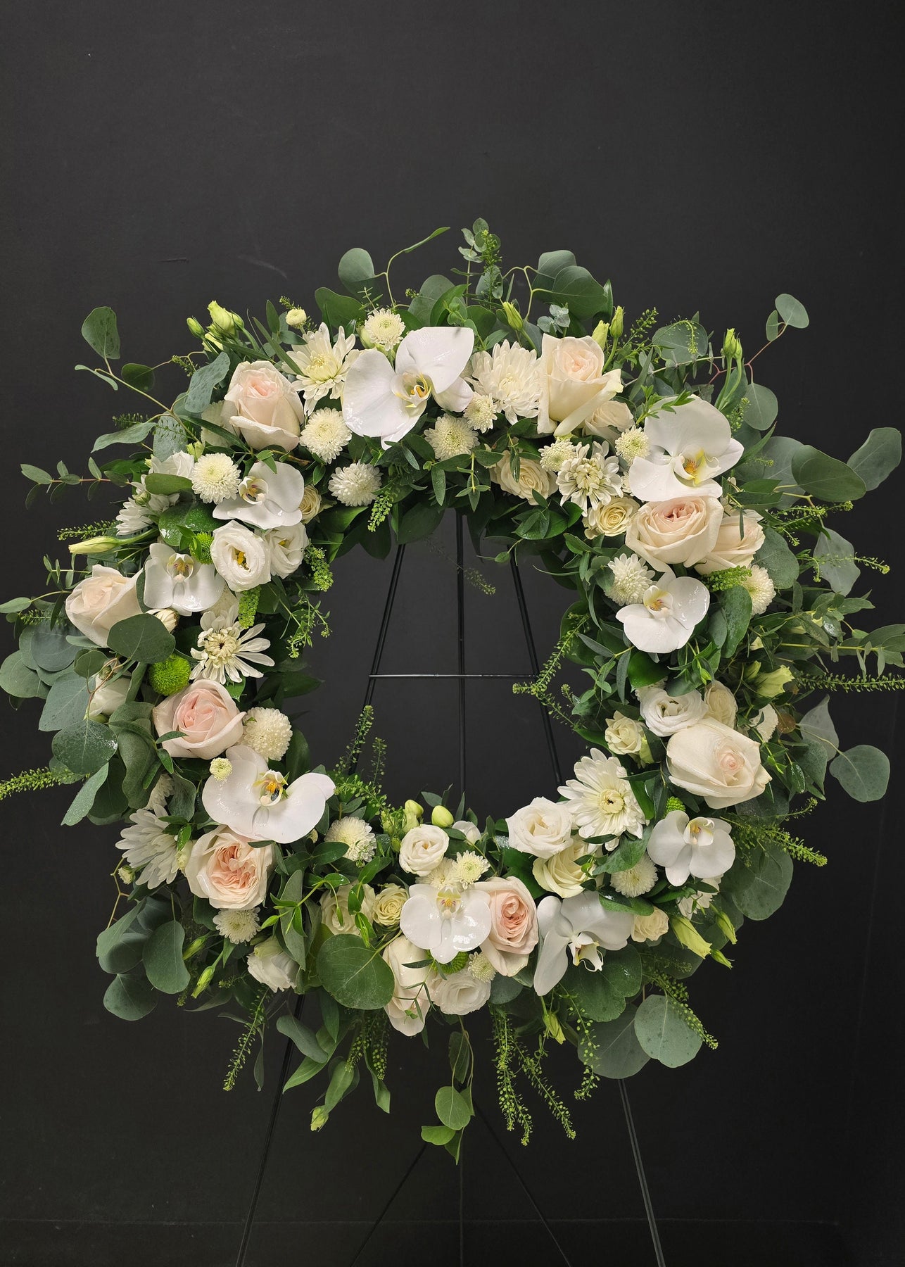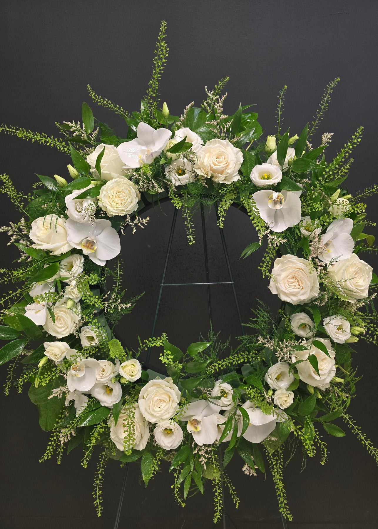 Floral wreath with white and green flowers orchids roses kermits lisianthus