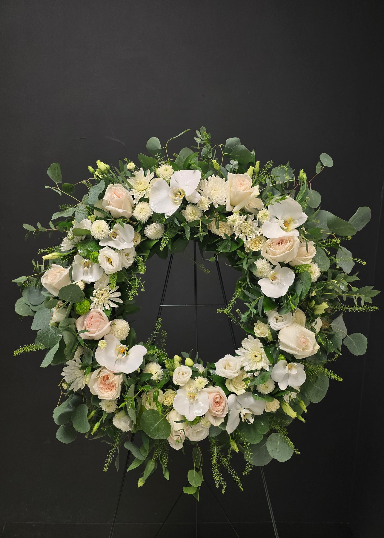 Floral wreath with white and green flowers orchids roses eucalypthus